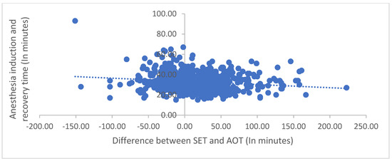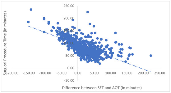 The scatter graph in Figure 2 illustrates the negative relationship between SET and AOT in pediatric dental procedures. Each data point represents a single procedure. The x-axis shows the difference between SET and AOT (in minutes), and the y-axis shows the total surgical procedure time (in minutes). The graph demonstrates a negative correlation between SET and AOT and the entire surgical procedure time. This indicates that procedures with a more negligible difference between SET and AOT tend to take longer. These findings are essential for improving time estimation accuracy in pediatric DRGA and optimizing patient outcomes.