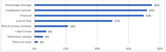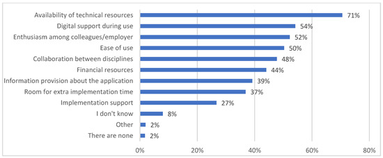 Enabling factors and barriers to the use or implementation of eHealth are presented in Figure 2 and Figure 3. Results for the analysis of professional needs are described in Table 5. The majority of participants indicated that the availability of technical resources (362 of 513 = 71%), digital support during use (278 of 513 = 54%), enthusiasm among colleagues/employers (268 of 513 = 52%) and ease of use (258 of 513 = 50%) were enabling factors that influenced the use or implementation of eHealth. By contrast, lack of knowledge (288 of 513 = 56%), inadequate tailoring to the older population in geriatric rehabilitation (276 of 513 = 54%) and financial issues (268 of 513 = 52%) were considered barriers to the use or implementation of eHealth.