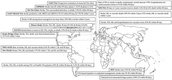 In France, the SOS-TIA (2003–2008) [5,16] provided a 24-hour toll-free telephone consult and rapid access to a hospital clinic. Thousands of family physicians, cardiologists, neurologists, and ophthalmologists in Paris and surrounding regions were informed and instructed to refer patients with cerebral ischemia to this TIA clinic. About half of these patients were seen in the clinic within the first day of symptom onset, and all patients received emergency assessments within 4 h of admission. About three-fourths of the patients were discharged home on the same day, and the 90-day stroke risk was 1.24%, much less than the prediction of the ABCD2 score (5.96%). Under the influence of the SOS-TIA model, another study (2012–2013) [24] dedicated two monitored beds inside the stroke unit. With support from the ED system, this model aimed to offer comprehensive imaging and other evaluations within 12 h of the onset of symptoms. The median delay to arrival at the TIA clinic in this study was 8 h, and referral by office-based physicians was the main factor resulting in a delay of over 12 h for the clinic evaluation after a TIA incidence. In another French model [18], patients with symptoms of TIA were primarily examined by an emergency physician. Patients with total recovery from the symptoms and routine investigations were managed as outpatients under the supervision of vascular neurologists within the next 8 to 15 days. Within 90 days of the index event, 1.7% of the patients managed in the outpatient setting presented with a stroke, and 5% had a subsequent TIA.