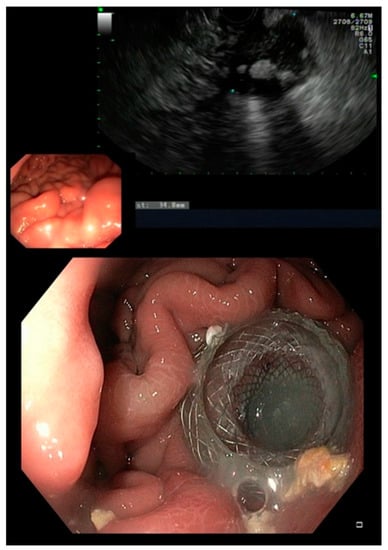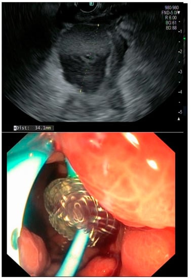 - Oh, D.; Lee, J.H.; Song, T.J.; Song, K.B.; Hwang, D.W.; Kim, J.H.; Park, D.H.; Lee, S.S.; Seo, D.W.; Lee, S.K.; et al. Clinical outcomes of EUS-guided transluminal drainage with a novel lumen-apposing metal stent for postoperative pancreatic fluid collection after pancreatic surgery. Gastrointest. Endosc. 2022, 95, 735–746. [Google Scholar] [CrossRef]