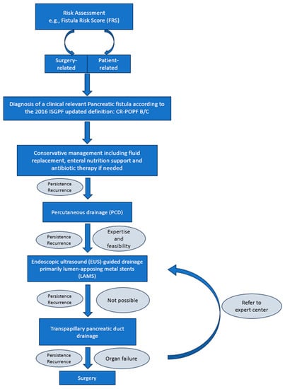Management of clinically relevant fistulas should be discussed across disciplines and be based on the updated ISPGPF grading []. Primary percutaneous catheter drainage is often the first intervention for CR-POPF in the absence of organ failure. Given its minimally invasive nature, percutaneous drainage results in a fistula closure rate of 77.1% []. Furthermore, endoscopic approaches such as transpapillary stent placements across leakages or sphincterotomy to decrease the pressure gradient at the pancreatic sphincter could be considered []. As EUS has become widely available, transmural stenting has started to influence the management of peripancreatic fluid collections (PFCs). The role of EUS-guided drainage has evolved from plastic stents to fully covered self-expandable metal stents (fcSEMS) and, recently, lumen-apposing metal stents (LAMS). These LAMS provide a single-step delivery platform guided by endoscopic ultrasound. They can be applied in various areas, including drainage of fluid collections, decompression of obstructed ductal systems, and to create connections between organs for further endoscopic interventions if needed. Another advantage of LAMS is their ability to closely approximate adjacent structures, reducing the risk of leaks and perforations. However, a thorough understanding of the technical aspects of LAMS placement is crucial to minimize complications and enhance clinical outcomes. Nonetheless, studies mostly focused on fluid collections following acute pancreatitis and walled off necrosis, whereas data on its use in the management of CR-POPF are rare. Surgical interventions for the treatment of pancreatic fistulas decreased continuously during the past decade, being reserved for patients who are not candidates for a minimally invasive intervention or whose condition is progressively worsening with catheter drainage. There is no agreement on how to use pharmacological treatments such as somatostatin analogues when fistulas are already present. The recently published Guidelines on the treatment of pancreatic cancer in Germany do, however, propose a periprocedural somatostatin treatment in high-risk situations referring to a meta-analysis that showed a reduction in frequency and complications of POPFs []. Adequate intensive care support, including enteral nutrition and antibiotic therapy, are mandatory in patients with organ failure and infection [].