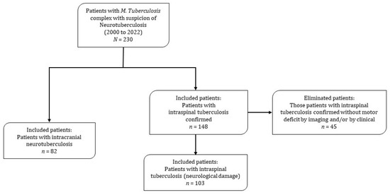 In the period of time considered in the cohort (22 years), 230 records of patients with diagnosis of tuberculosis and a high probability of having neuroTB were reviewed in depth. Of 148 patients who presented vertebral tuberculosis, 45 patients were excluded because they did not present neurological damage, ruled out by imaging and clinical data. The frequency of intraspinal neuroTB was estimated out of 69.6% (103/148) in hospitalized patients with Pott’s disease. Therefore, the neurological cohort was made up of a total of 185 patients: 103 (55.7%) patients with intraspinal neuroTB and 82 (44.3%) patients with intracranial neuroTB. It should be noted that seven patients presented both intracranial and intraspinal neuroTB and were classified in the group of patients with intracranial neuroTB. This decision to assign them to this group was taking into account that intracranial neuroTB has a poorer prognosis (Figure 1).