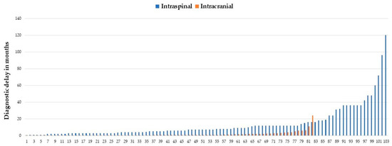 Figure 3 provides information on the delay in diagnosis for each of the patients included in the groups with intraspinal (103 patients) and intracranial (82 patients) neuroTB. Where longer delay in diagnosis were observed for patients with intraspinal neuroTB, reaching up to 120 months.