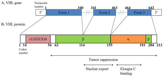VHL gene structure (A) and VHL protein structure (B). The gene spans 10 kb and comprises three exons. The VHL protein is produced in two forms: an 18 kDa protein and a 30 kDa protein. The protein encoded by this gene is a component of the protein complex that includes elongin B, elongin C, and cullin-2, and it possesses ubiquitin ligase E3 activity. This activity is thought to be the main action of the VHL protein. The VHL protein consists of 214 amino acids and has two structural domains: the α-domain and the β-domain [1,6].