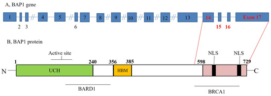 BAP1 is a nuclear-localized deubiquitinating enzyme with ubiquitin carboxyl hydrolase activity and two nuclear localization signal motifs [11,15,16,17]. It has also been speculated that the BAP1 gene is located on chromosome 3p21.1, a genomic region frequently mutated in a variety of human malignancies [18,19] (Figure 2).
