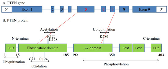 PTEN is a tumor suppressor gene on chromosome 10q23.3 that encodes a 403 amino acid dual-specificity lipid and protein phosphatase (Figure 3) [20,21,22,23].