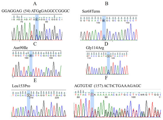 Three of the six identified mutations were located in exon 1, two in exon 2, and one in exon 3. The identified mutations were the following: In exon 1: 1, GGAGGAG (54) ATGgGAGGCCGGGC in heterozygous form: this is an insertion of a guanine at position 54; 2, Ser68Term in heterozygous form: this is a nonsense point mutation, where the serine-68 residue changed to stop codon; 3, Asn90Ile heterozygous form: this is a missense mutation with amino acid change (asparagine to isoleucine) at position 90 [32,33]. In exon 2: 4, Gly114Arg in heterozygous form: this is a missense mutation with an amino acid change (glycine to arginine) at position 114 [34]; 5, Leu153Pro in heterozygous form: this is a missense mutation with an amino acid change (leucine to proline) at position 153 [35]. In exon 3: 6, AGTGTAT (157) ACTtCTGAAAGAGC in heterozygous form: this is an insertion of a thymine at position 157 [36].