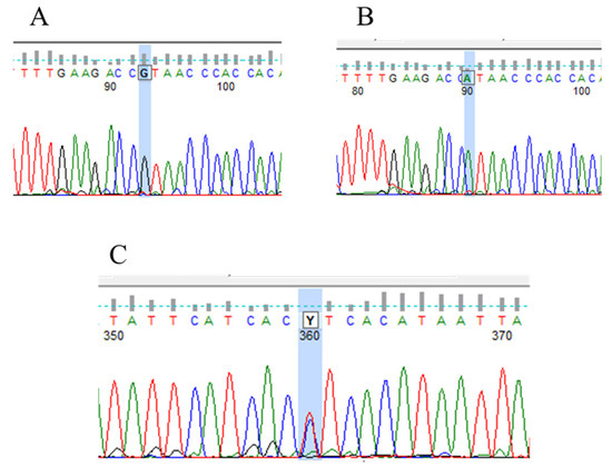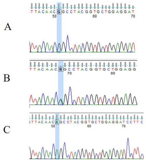 Electropherograms representing (A) wild type (n = 2), (B) heterozygote type (n = 9), and (C) homozygote (n = 13) type of VHL IVS1-195 nt G/A (rs779805) polymorphism.