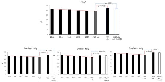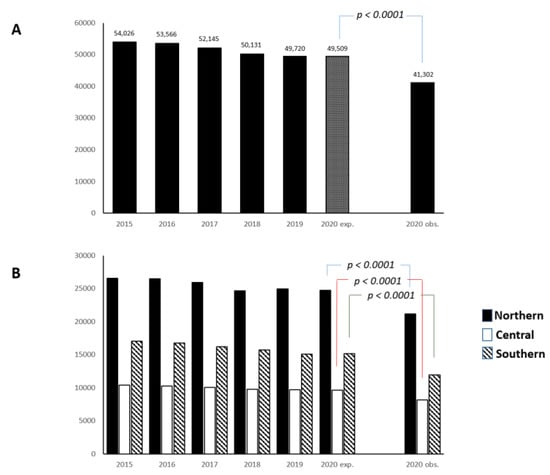Compared with the previous 5 years, the rate of admissions for ischemic stroke in 2020 was markedly reduced (from 54,026 in 2015 to 41,302 in 2020; percentage change −23.5). Considering the 5 year trend, the observed number of stroke admissions in 2020 was significantly reduced as compared with the expected number (41,302 vs. 49,509; p < 0.0001) (Figure 1A). The reduced rate in the number of stroke admissions in 2020, as compared with the expected rate based on trends, was consistent in Northern, Central, and Southern Italy (all p-values < 0.0001) (Figure 1B).