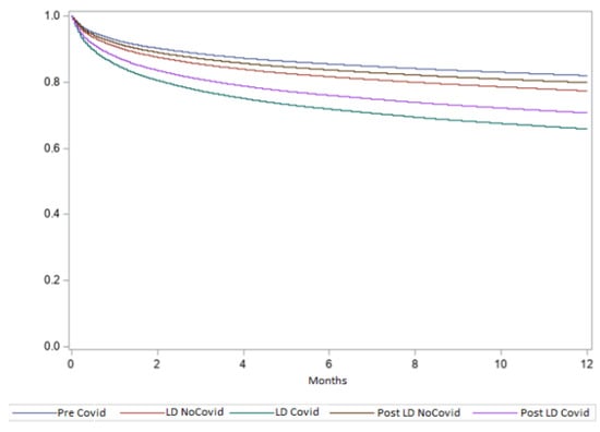 Cox-adjusted survival curves regarding the 1 year mortality rate of stroke patients, with or without a COVID-19 diagnosis, admitted in Italy during the pre-COVID-19 (11 March–31 December of 2015–2019), lockdown (LD; 11 March–3 May 2020), and post-lockdown (Post LD; 4 May–31 December 2020) periods.