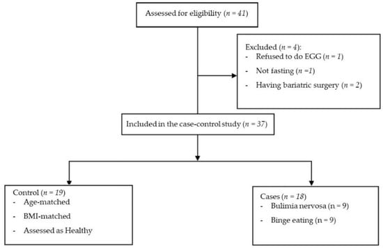 This study was a matched case–control study conducted between February and December 2022 at the Clinical Nutrition Clinic, College of Applied Medical Sciences, and the Psychiatric Clinic, College of Medicine, King Saud University, Riyadh, KSA. A sample size of 38 participants (19 per group) was calculated using the G* power software (G*Power 3.1.9.7, Heinrich Heine University, Dusseldorf, Germany) to meet 80% power and an α level of 0.05 based on the previous finding of the GMA difference between ED patients and healthy controls [19]. Diamanti et al. [19] stated that the mean ± SD of postprandial gastric rhythm at 3 cycles per minute of the control group (n = 16) was 83.9 ± 17.7%, and for the bulimic group (n = 10), it was 45.2 ± 29.6% (effect size of 1.587) resulting in a minimum sample size of 16 (8 per group). Recruitment was conducted via an open invitation for participation which was announced via social media and hospital fliers. The participants included in this study were aged 18 to 60 years, had no gastrointestinal (GIT) diseases or previous surgeries, and were not taking medications affecting GIT functions (such as prokinetic, anti-emetic, and non-steroidal anti-inflammatory medications) or medications affecting hydration status or metabolic rate. In addition, they had no history of existing chronic diseases, such as cancer or heart disease. Pregnant women or those with other psychiatric disorders were also excluded. The ED group consisted of patients meeting the fifth edition of the Diagnostic and Statistical Manual of Mental Disorders (DSM-5) criteria for BED or BN, while age- and BMI-matched women without an ED were selected as the healthy controls (Figure 1). All participants were screened for the presence of EDs using the Eating Disorder Examination Questionnaire, version 6 (EDE-Q 6.0) [12]. The number of binge episodes was assessed by asking the participants how many binge eating episodes per week they had in the previous 3 months, in addition to using the EDE-Q 6.0 questionnaire. Informed consent was given; the participants were instructed about the study purpose, setting, procedure, and benefits, and their participation was voluntary. The Institutional Review Board (IRB) of the College of Medicine, King Saud University, approved the study protocol under reference number 22/0056/IRB, dated 18 January 2022.