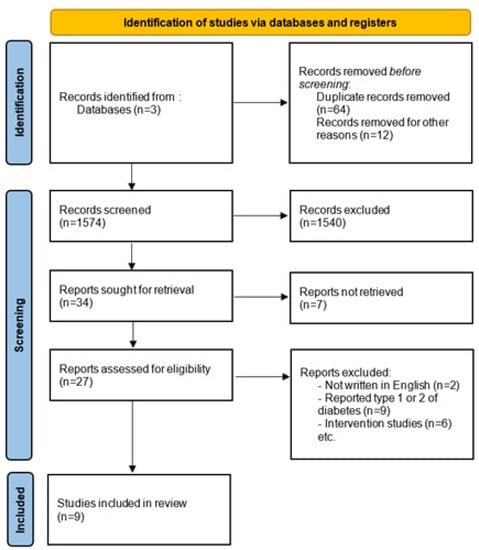 After eliminating duplicate articles and conducting a preliminary assessment of titles and abstracts, a total of 34 studies were subjected to further evaluation for eligibility. Subsequently, only 9 articles that met the inclusion criteria were selected for the review. The trial flow diagram is shown in Figure 1.