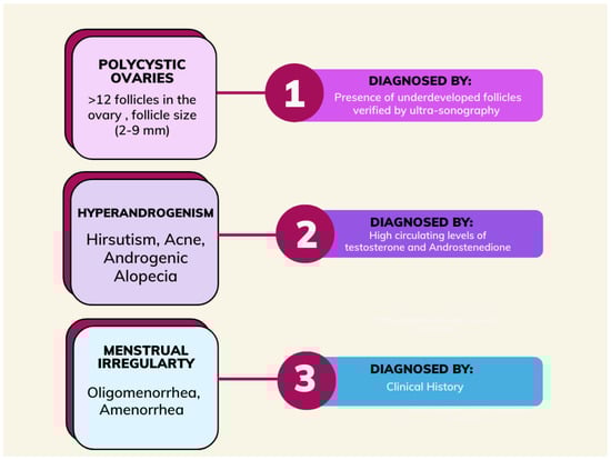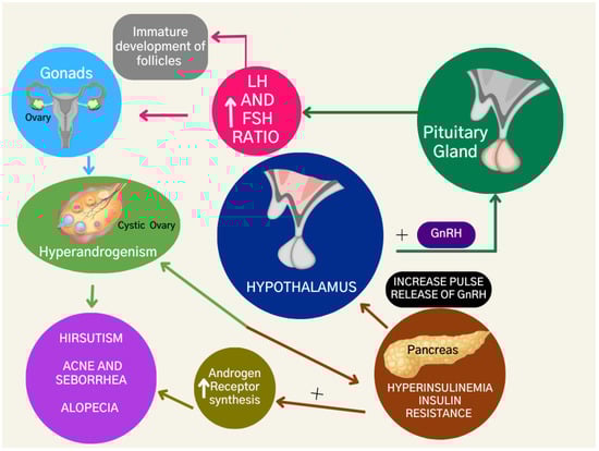 In accordance with the Rotterdam criteria, polycystic ovary syndrome is defined based on the presence of two of the three criteria after other pathologies, such as congenital adrenal hyperplasia, thyroid abnormalities, and hyperprolactinemia, have been excluded. The Rotterdam criteria include irregular menses, hyperandrogenism, and ovarian volume greater than or equal to 10 mL with or without 12 or more peripheral antral follicles ranging from 2–9 mm in one or both ovaries [8]. In women with PCOS, symptoms do not appear until puberty (Figure 1) [9].