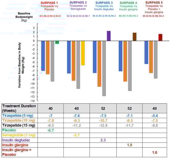 Changes from baseline body weight to end of treatment in SURPASS 1-5 [109,110,111,112,113].