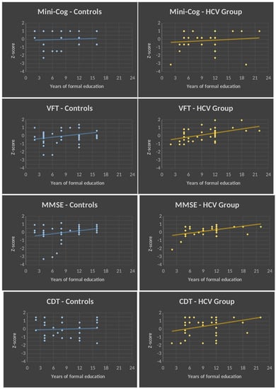 Among the factors that interfere with cognitive performance, the number of years of formal education deserves particular emphasis. Several cognitive tests, such as the Mini Mental State Examination (MMSE) and verbal fluency tests (VFTs), are strongly associated with years of formal education. Indeed, the vocabulary and arithmetic skills present in some neuropsychological tests depend heavily on formal education. One way to circumvent this problem and reduce variability is the use of norms based on years of formal education. However, research has shown that years of education may overpredict estimated reading and mathematical levels in Latin Americans []. In Brazil, the association between years and quality of education depends on demographic variables such as location of schooling, place of birth, and parental literacy []. Moreover, it is expected that more than 50% of Brazilians read at least 3 or more years below their educational level [,]. Therefore, the use of Brazilian norms based on years of formal educational is controversial. To circumvent these limitations, the participants of the control group of this study were attending the same hospital where all of the HCV carriers were selected.