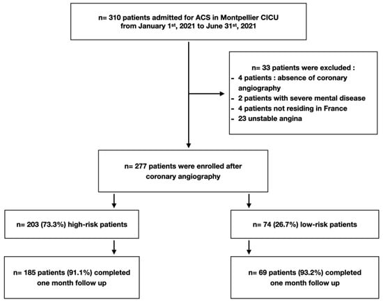 Among 308 patients admitted for ACS within the study period, 277 were studied including 174 STEMI patients (62.8%) and 103 NSTEMI patients (37.2%) (Figure 1). Population baseline characteristics are presented in Table 2. At admission, median left ventricular ejection fraction was 50% (45–60) and 17 patients (6.1%) had unstable hemodynamics.