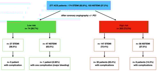 Contemporary practice for NSTEMI management has changed since 2020 and includes an early invasive strategy (<24 h) in stable patients and concomitant use of evidence-based medications, such as potent antithrombotic and antiplatelet therapy, statins and B-blockers [3,4,8]. Among ACS patients managed with an early invasive strategy, the ACUITY study emphasizes the prognostic importance of the diagnostic angiogram in patient risk stratification, providing important added independent predictive value for 30-day and 1-year ischemic outcomes [18]. In our study, low rate of events with no life-threatening events was observed in the low-risk group with risk stratification including diagnostic angiogram and PCI result. Meta-analyses have consistently reported that an early invasive strategy is associated with a lower risk of recurrent/refractory ischemia and a shorter length of hospital stay [19,20,21,22]. In the meta-analysis of Jobs et al., early evaluation of coronary anatomy and PCI when required, was found to reduce mortality only in higher risk patients [22]. In the present study, both early coronary angiography and high rate of PCI may probably have contributed to the low rate of events of our NSTEMI population. In our STEMI population, 15% of the patients were considered at low risk using strict selection criteria including early or spontaneous, successful reperfusion with no adverse events at follow-up in this group and particularly no rhythmic events. Early spontaneous reperfusion was previously associated with favorable short- and long-term prognosis following STEMI [23]. Conversely, incidence of in-hospital adverse events in the high-risk group was high (18.7% in the total population and 20.4% in the STEMI group) and mainly related to rhythmic disorders or hemodynamics instability and required CICU admission or at least ECG monitoring. These patients may be characterized by simple clinical characteristics (age and LVEF) and angiographic patterns (multivessel disease, left main disease and lower rate of PCI).