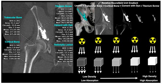 Computerized tomography (CT) has remained a mainstay in the standard of care for medical and orthopedic management of metastatic skeletal disease. CT scans are interpreted based on Hounsfield Units (HU), which capture radio density based on the attenuation coefficients of radiation beams (Figure 1). While a dimensionless unit, HU ranges are as follows: 100–300 for soft tissue, 300–400 for cancellous bone, 500–1900 for cortical bone, and 2800–3200 for titanium []. The emerging paradigm of applying HU in the setting of osteoporosis and fracture risk has been well described in the literature []. Moreover, their correlation with the gold-standard dual-energy X-ray absorptiometry (DEXA) scans has ranged from moderate to strong, supporting their sensitivity in capturing bone mass changes [,,]. Because true bone mass cannot be directly measured in a living patient, an indirect assessment via HU changes was performed.