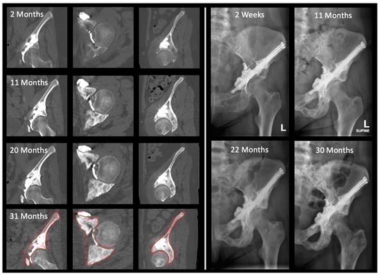 (Left panel) Progressive CT imaging showing coronal, axial, and sagittal regions of interest (femur was not included in region of interest selection). Red outline indicates the region of interest used in measurement. (Right panel) Progressive plain X-ray radiographs of similar time points. Throughout the post-operative period, the patient exhibited continual visceral organ cancer progression as well as documented skeletal disease progression in the pelvis, femur, sacrum, spine, and humerus. Patient received additional skeletal surgery in the humerus, contralateral acetabulum/femur region, and sacrum. Patient received 30 Gy in 10 fractions of radiation therapy, chemotherapy, and bisphosphonate regiments. Patient is alive and ambulating well at time of study censure. Measured bone mass change between 2 months and 31 months of 35.6% on 3D volumetric grayscale and 2D coronal, axial, and sagittal of 45.9%, 209.5%, and 34.6%, respectively.