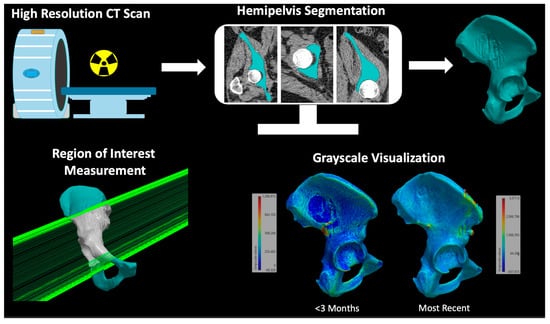 Workflow for the generation of a 3D grayscale-based volumetric assessment of the periacetabular region of interest. A high-resolution CT scan of at least 5.0 mm slice thickness is imported into ScanIP software (2022.12) for segmentation to model the hemipelvis. A region of interest in the periacetabular region is selected for grayscale-based measurement. Hemipelvis based on grayscale values is shown for visualization.