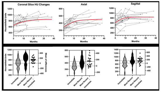 CT scans demonstrated an overall trend of increasing HU across all timepoints in all three planes of ROI (Figure 5). From baseline CT (1.2 ± 1.1 months) to most recent CT scan (20.2 ± 12.1 months), the median HU increased 124.0 in coronal, 140.3 in axial, and 151.9 in sagittal plane (all p < 0.0005). The wbHU at 6 months and 1 year (12.0 ± 1.6 months) were significantly increased compared to the baseline CT scan, as shown in Table 2.