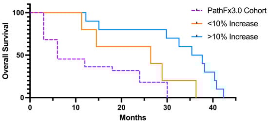 Overall censured survival curve. PathFx3.0 predicted survival of overall cohort included as reference. Patients with at least a 10% increase in relative bone mass as assessed by wbHU demonstrated superior median survival of 36.5 months compared to those who did not (p < 0.05). Time point selected was 12 months.