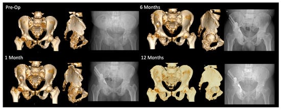 Plain X-ray radiograph and CT reconstruction view of periacetabular disease progression across 12 months. Patient experienced documented visceral organ progression with no history of radiation therapy or chemotherapy. Patient had history of bisphosphonate therapy during the post-operative period and was alive and ambulating well at time of study censure. Measured relative bone mass improvement of 33.7% on 3D volumetric grayscale and 2D coronal, axial, and sagittal of 21.1%, 63.4%, and 16.1%, respectively.