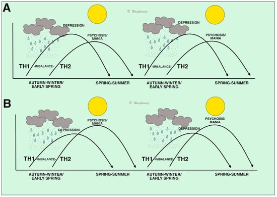 Disturbances in the balance of the Th1–Th2 immune response in people immunogenetically prone to depression (A) and schizophrenia/mania (B). In the figure, greater susceptibility to hyperactivation of the Th1 system may result from viral infection in the autumn–winter/early spring season, when there is higher humidity and a higher risk of pathogen droplet transmission or consuming pathogens by drinking condensed water-containing viruses. These events may result in a depressive phenotype. In spring and summer, when humidity and pathogen loads decrease, compensatory Th2 properties are activated. In individuals immunogenetically susceptible to psychosis and/or mania, Th2 inhibition of the Th1 system may be excessive and lead to Th2 hyperactivation and subsequent manic/psychotic states.