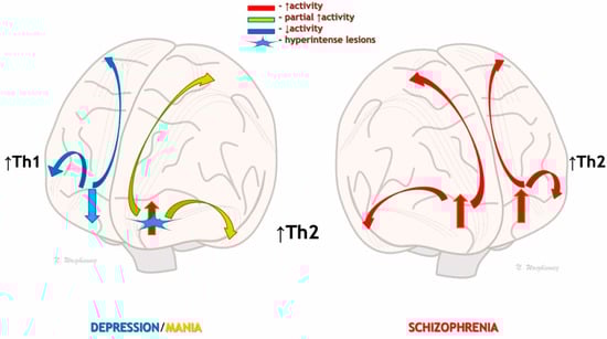 Disturbances in cortical activation depending on the activity of Th1 and Th2 immune responses in depression, mania, and schizophrenia. In autumn–winter depression, hyperactivation of the Th1 system may lead to inflammatory inhibition of prefrontal activity and subcortical centers responsible for mood, drive, and motivation (left side). During the spring–summer predominance of Th2 activity, there may be hyperactivation of the prefrontal areas and secondary hyperactivation of the subcortical centers responsible for mood and drive, resulting in psychotic/paranoid symptoms (right side). In people undergoing a manic episode (left side), hyperintense changes in the white matter may be responsible for the partial activation of subcortical centers and prevent full paranoid psychosis. Thus, psychosis may be mood-congruent.
