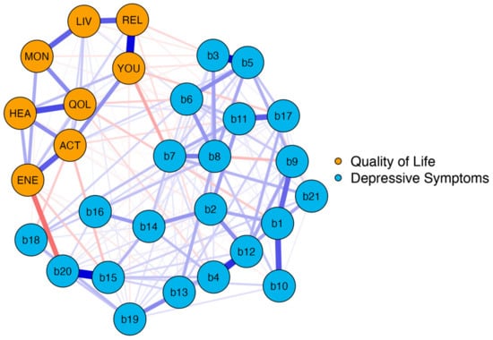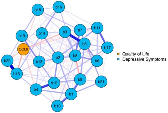 In the second network, we analyzed the association between BDI-II items and the distinct EUROHIS-QOL items. The network plot of model 2 is shown in Figure 3. The blue nodes represent the BDI-II items (b1–b21) and the orange nodes represent the eight items of the EUROHIS-QOL.
