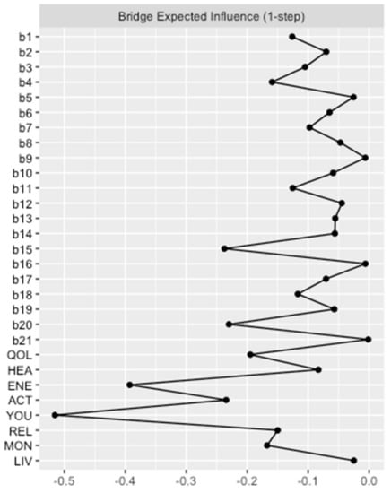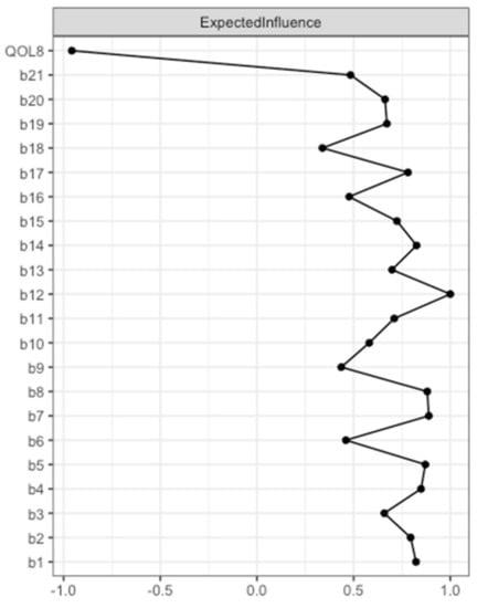 Again, network analysis demonstrated a well-connected network (183 of 406 non-zero edges) without isolated nodes. One can distinguish two parts reflecting the two different questionnaires. However, there were many interactions between the nodes of the BDI-II and the EUROHIS-QOL. These interactions were primarily negative, as depicted by the red edges. This implies that a lower intensity of depressive symptoms is associated with a higher QoL. The strongest negative connection between the two parts was observed between “tiredness or fatigue” and “Do you have enough energy for everyday life?” (b20 and ENE), which is not surprising as both are similar constructs. However, identifying the depressive symptoms that are linked with all eight items on the EUROHIS-QOL questionnaire is a matter of great interest. This is why Bridge Expected Influences were determined. The Bridge Expected Influence centrality measures are shown in Figure 4 (and also tabulated in Table S2). The nodes b15 (loss of energy) and b20 (tiredness or fatigue) were found to have the highest Bridge Expected Influences, suggesting that they are the most strongly associated depressive symptoms with all eight items on the EUROHIS-QOL questionnaire. Thereby, node b15 is associated in particular with ACT (How satisfied are you with your ability to perform your daily living activities?) (edge weight: −0.102). This means that feeling loss of energy has greatest influence on the ability to perform daily living activities among the QoL domains. Moreover, node b20 showed an association with ENE (Do you have enough energy for everyday life?) of the quality-of-life domain (edge weight: −0.236). Respectively, patients who reported tiredness or fatigue had less energy for everyday life. As revealed by the network plot of model 2 (Figure 3), these two depressive symptoms with the highest Bridge Expected Influence (loss of energy and tiredness or fatigue) were closely connected to each other. Loss of pleasure (b4) was the third influential depressive symptom, which is especially associated with QOL (How would you rate your quality of life?; edge weight: −0.063) and REL (How satisfied are you with your personal relationships?; edge weight: −0.053).