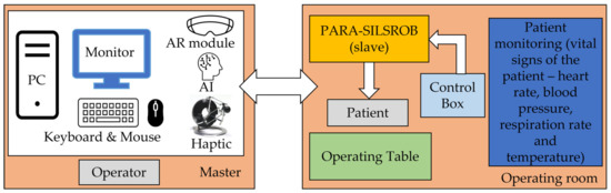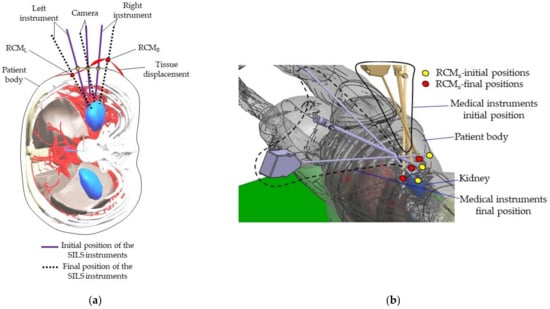 - Preparation: patient anesthesia, operating room preparation, position the robot to the SILS port trocars (where the Artificial Intelligence module developed in [35] can be used), save the laparoscope RCM and find the RCML and RCMR positions using the 6-DOF parallel robot;
