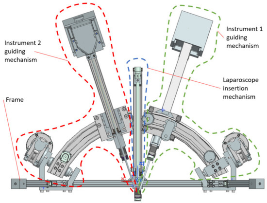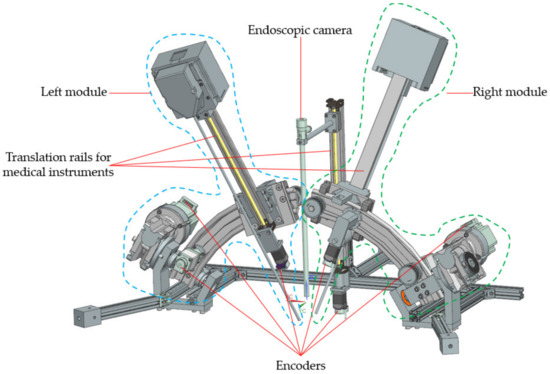 - Surgical task: the MP is locked in position, and the two modules guiding the active instruments perform individual tasks, remotely guided by the surgeon. It becomes obvious that if the laparoscope requires further orientation, which is performed with the MP, the RCML and RCMR positions will be altered, and a compensation motion will be from the two modules is required.