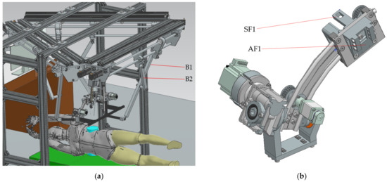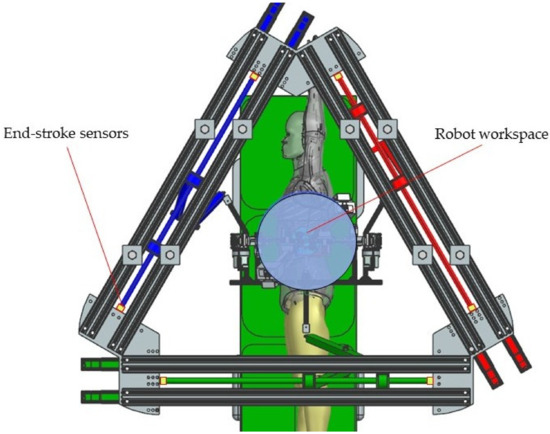 - MP positioning towards the targeted lesion: the amplitude of the movements of the modules attached to the mobile platform is limited to ±45° [29].