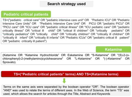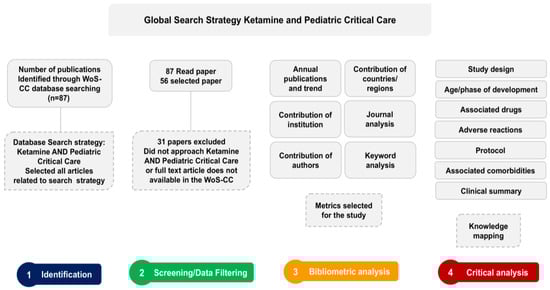 A global search was performed on ketamine in the context of pediatric critical care patients in the Web of Science Core Collection (WoS-CC) database. The search strategy applied to retrieve the articles is shown in Figure 1.