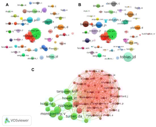 According to researchers, 287 authors contributed at least 1 article (Figure 3A). The higher numbers of articles were written by Tobias, J.D., Nishisaki, A., Turner, D.A., Yildizdas, D., Johnsom, P.N., and Miller, J.L. (n = 3 per author). Regarding the number of citations, Tobias, J.D. (n = 313) also represents the author that received the higher number of citations, followed by Becke, K. (n = 108), Engelhard, K. (n = 108), Sinner, B. (n = 108), Bar-Joseph, G. (n = 101), Guilburd., J.N. (n = 101), Guilburd, N. (n = 101), Tamir, A. (n = 101), and Nishisaki, A. (n = 95) (Figure 3B). The most relevant co-authorship networks were performed by Nishisaki, A. (Figure 3C).