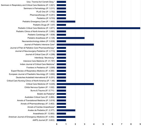 According to journals, only 7 journals of a total of 37 periodicals published at least two articles (Figure 4). Among them, the journal Pediatric Critical Care Medicine (n = 9; JCR impact factor: 3.971) exhibited the highest number of published articles, followed by the journal Critical Care Medicine (n = 4; JCR impact factor: 9.226) and the Journal of Pediatric Intensive Care (n = 4). It is important to highlight that both Critical Care Medicine and Pediatric Critical Care Medicine belong to the Society of Intensive Care Medicine, one of the most important and influential entities in the field of pediatric intensive care.