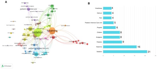 Keywords represent an important topic of a research article. In this study, a total of 166 keywords were found (authors’ keywords), grouped into 20 clusters (Figure 5A). Figure 5 also exhibits the co-occurrence of keywords through the lines that interconnect the clusters. The top 10 most frequent keywords were sedation (n = 21), ketamine (n = 16), pediatric (n = 9), analgesia (n = 8), children (n = 8), propofol (n = 6), pediatric intensive care unit (n = 5), pain (n = 4), delirium (n = 4), and anesthesia (n = 4) (Figure 5B).