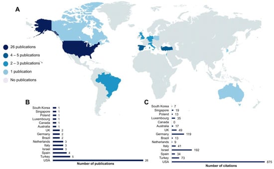 Worldwide distribution of all selected articles (A) with the representation of countries from published articles (B) and the total number of citations (C).