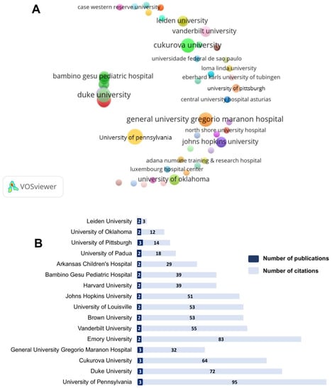A total of 124 distinct institutions, grouped into 43 clusters, were involved in the publication about ketamine in the PICU context (Figure 7A). Only 16 institutions published at least two papers (Figure 7B). The most prolific institutions are concentrated in the United States, totaling 13 institutions (University of Pennsylvania, University of Pittsburgh, Emory University, Vanderbilt University, Brown University, University of Louisville, Johns Hopkins University, Harvard University, Arkansas Children’s Hospital, University of Pittsburgh). These institutions published at least two papers (Figure 7B).