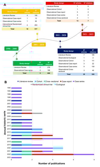 In accordance with the frequency of publication, the period ranging from 2011 to 2020 (n = 28) showed the highest number of productions and citations (Figure 8A,B). However, the period ranging from 1990 to 2000 exhibited a lower number of publications (n = 5), but a notable number of citations (n = 444). Furthermore, case series study (n = 17) and literature review (n = 14) were the most prevalent studies, with a total of 30 publications. In addition, review articles were the type of study with the highest number of citations (n = 658) (Figure 8A,B).