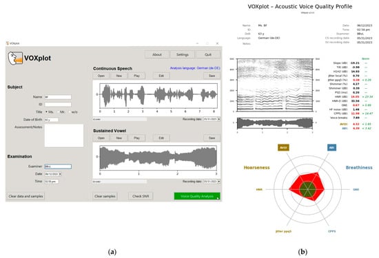 VOXplot version 2.0: (a) the user interface for preparing the acoustic analysis of continuous speech and/or sustained vowels selected in the English language with the analysis language German for the thresholds evaluations of AVQI and ABI; (b) the outcome of the main voice quality parameters in VOXplot, which are evaluated quantitatively and/or qualitatively for hoarseness and breathiness.