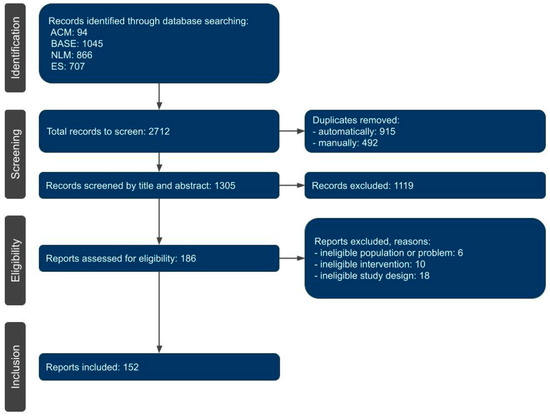 The following search engines were used: (1) Association for Computing Machinery: Guide to Computing Literature (ACM; 3,470,491 records) [29]; (2) Bielefeld Academic Search Engine (BASE; 320,685,924 records) [30]; (3) National Library of Medicine: PubMed (NLM; over 35,000,000 records) [31]; (4) Elsevier Scopus (ES; over 87,000,000 records) [32,33]. For each search engine, the necessary query modifications were made to ensure the validity of the search (Table A1). Filters were used to exclude studies published before 2017, where possible.