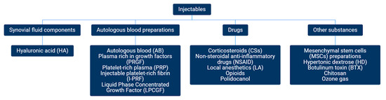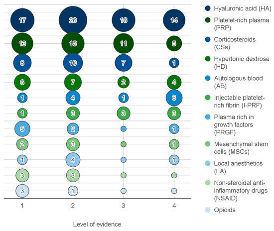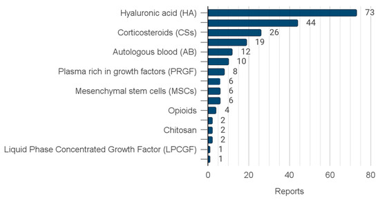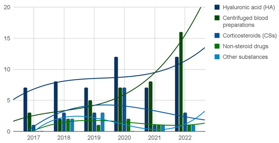 Substances used as drugs for other indications, normally with other routes of administration, are included in this group. CSs are definitely the best studied among them. After HA and PRP, CSs were the third most frequently reported injectables group in 2017–2022 (8 systematic reviews, 10 randomized trials, and 8 other trials) [19,25,38,39,41,45,47,47,49,51,54,62,75,86,121,125,127,134,135,137,140,156,164,166,171]. Nevertheless, since 2020, the number of primary studies on intra-articular injection of CSs has clearly decreased. Other papers describe the use of non-steroidal anti-inflammatory drugs (NSAIDs), local anesthetics (LAs), opioids, and polidocanol. These substances have been used exceptionally and so far there is no well-established knowledge about their effectiveness and safety [24,37,38,62,73,77,79,97,101,108,137,150,165].