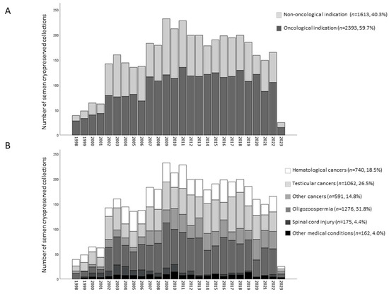 Number of semen cryopreserved collections (total, n = 4006) performed per year (from February 1998 to February 2023) in the different groups of subjects undergoing cryobanking, dividing by oncological and non-oncological indication (A) or by medical condition (B).