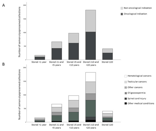 Number of semen collections according to the duration period of cryopreservation in the different groups of subjects undergoing cryobanking, divided into oncological and non-oncological indications (A) or by medical condition (B).