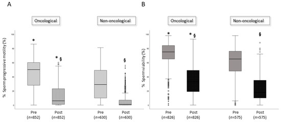 Box plots representing sperm pre- and post-cryopreservation progressive motility (A) and viability (B) in the group of oncological and non-oncological indications with sperm concentrations of ≥2 × 106/mL at baseline. * p < 0.05 vs. Non-oncological indication, Mann–Whitney test; § < 0.05 vs. Pre-cryopreservation, Wilcoxon test.