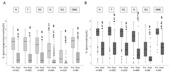 Box plots representing sperm pre- and post-cryopreservation progressive motility (A) and viability (B) in the different groups of subjects undergoing cryobanking with sperm concentrations of ≥2 × 106/mL at baseline. H: Hematologic cancers; T: Testicular cancers; OC: Other cancers; O: Oligozoospermia; SCI: Spinal cord injury; OMC: Other medical conditions. a: p < 0.05 vs. H; b: p < 0.05 vs. T; c: p < 0.05 vs. OC; d: p < 0.05 vs. O; e: p < 0.05 vs. SCI; f: p < 0.05 vs. OMC, Mann–Whitney test. § < 0.05 vs. Pre-cryopreservation, Wilcoxon test.