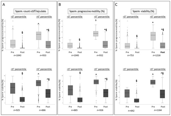 Box plots representing pre- and post-cryopreservation sperm progressive motility (upper panels) and viability (lower panels) divided according to the 5° percentile of WHO 2010 reference values of basal sperm count (A), progressive motility (B) and viability (C). ^ p < 0.05 vs. <5° percentile, Mann–Whitney test. § < 0.05 vs. Pre-cryopreservation, Wilcoxon test.