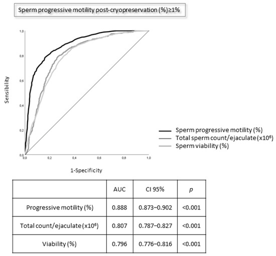 ROC curves of all basal sperm characteristics (total sperm count, progressive motility, and viability) predict post-cryopreservation sperm progressive motility of at least 1% with good accuracy (Figure 6). In particular, higher AUC values were observed for basal progressive motility. Cut-off values for at least 1% progressive motility recovery were 21 × 106/ejaculate (sensitivity 80% and specificity 80%) for sperm number, 30% (sensitivity 76% and specificity 95%) for sperm progressive motility, and 63% (sensitivity 76% and specificity 72%) for sperm viability.